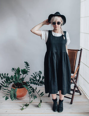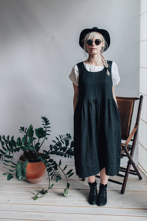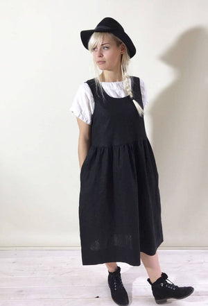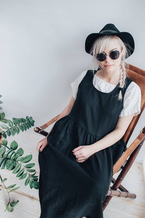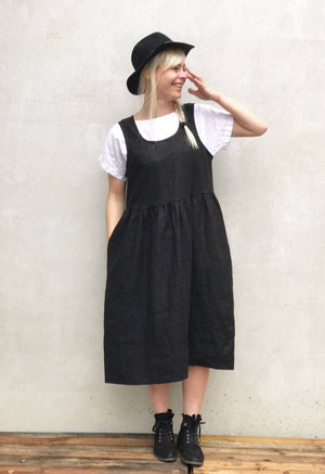 Simple and comfortable linen pinafore sundress with handy pockets. Wear it alone or with a shirt underneath.