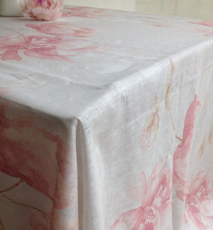 Romantic light greyish linen tablecloth with soft pink and white printed flowers. Made from 100% pure European linen.