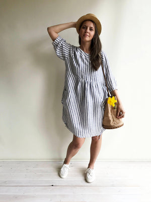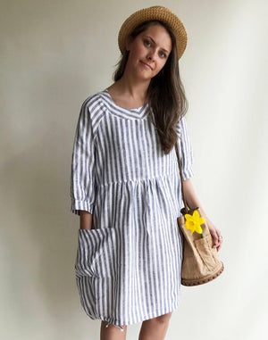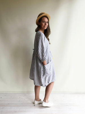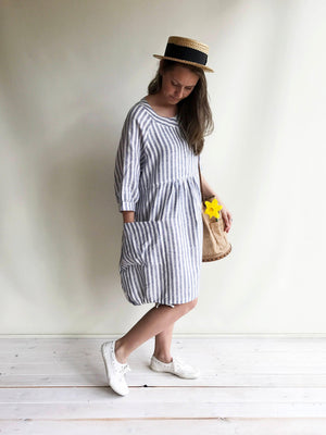 Lightweight and summery linen dress in lovely blue stripes. Very feminine and comfortable with handy patch pockets.