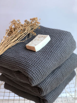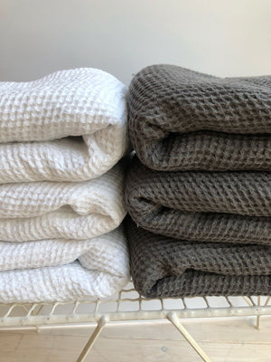 White or grey waffle pattern bath towel with gorgeous that will give you a good massage after your bath, shower or sauna.