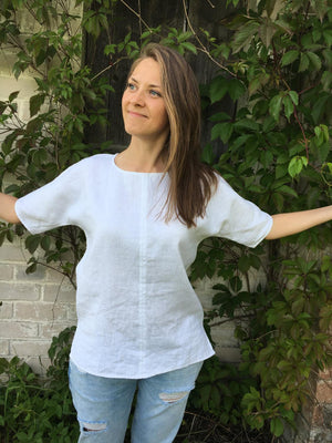 We offer these tops in milky white, natural taupe (undid) or pale peach linens.