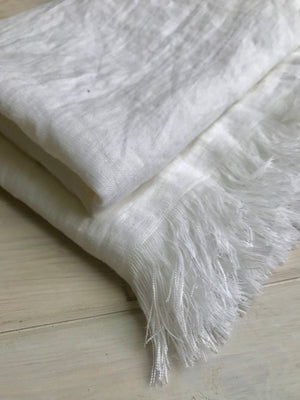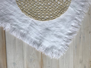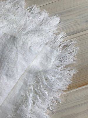 Simple and gorgeous white linen tablecloth with 2" fringes.